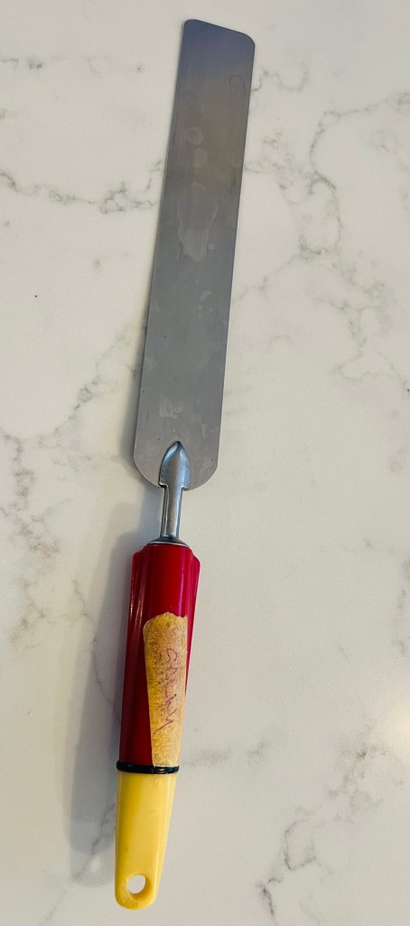 Sally put her name on a piece of masking tape attached to a dish or serving utensil for every rummage sale, potluck, and church social. Usually, they were baked on, her distinctive printed SALLY, still coming through the years of oven time. Every time I come upon one, I smile. There’s an offset spatula that I’m particularly attached to, even though the tape is starting to curl and won’t be there forever. I love to rub my thumb over it and know that hers was there once too.